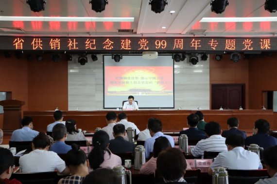7月1日,在全党上下庆祝中国共产党成立99周年之际,省供销社党组书记、理事会主任刘延生为机关党员干部和直属单位党政正职讲授了题为《把握制度优势 展示中国力量 做复兴征程上信念坚定的“供销人”》的专题党课。在讲授中,刘延生围绕“中国特色社会主义制度的显著优势”“打赢疫情防控人民战争的中国力量”“复兴征程上‘供销人’的坚定信念”三个方面内容,同与会党员干部进行了交流分享。